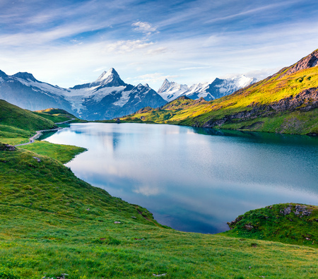 Colorful summer evening on Bachalpsee lake with Schreckhorn and Wetterhorn peaks on background. Green morning scene in the Swiss Bernese Alps, Switzerland, Europe. Beauty of nature concept background.