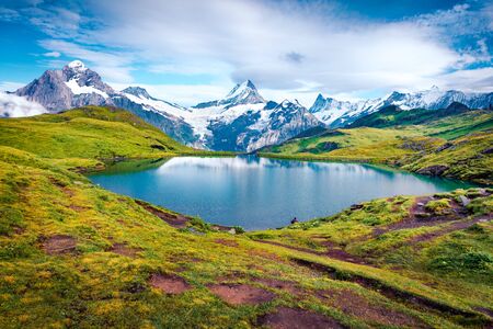 Picturesque summer view of Bachalpsee lake with Schreckhorn peak on background. Majestic morning scene of Swiss Bernese Alps, Switzerland, Europe. Beauty of nature concept background.
