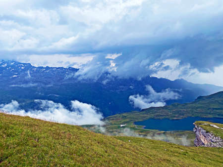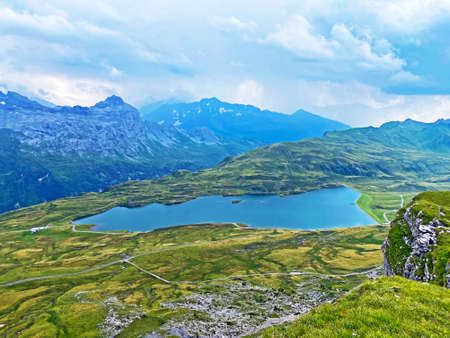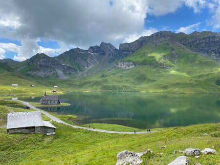 The alpine lake Melchsee or Melch Lake in the Uri Alps mountain massif, Kerns - Canton of Obwalden, Switzerland (Kanton Obwald, Schweiz)