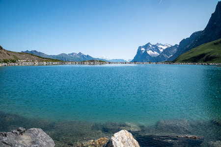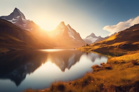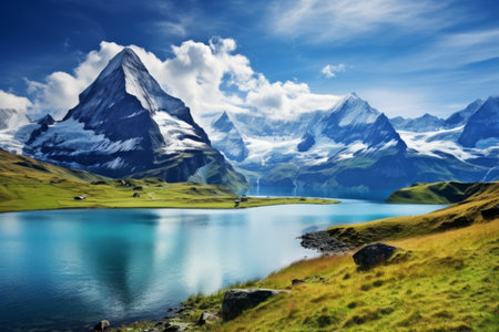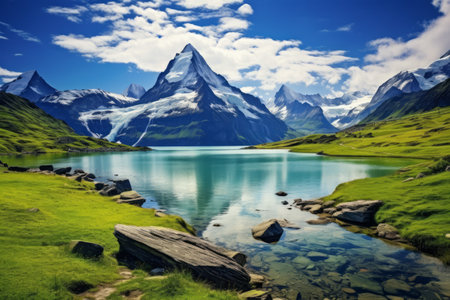 Sunny Bachalpsee lake in Switzerland reflects alpine beauty