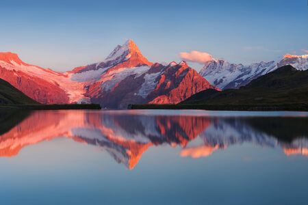 Fantastic landscape at sunrise over the lake in the Swiss Alps, Europe. Wetterhorn, Schreckhorn, Finsteraarhorn et Bachsee.