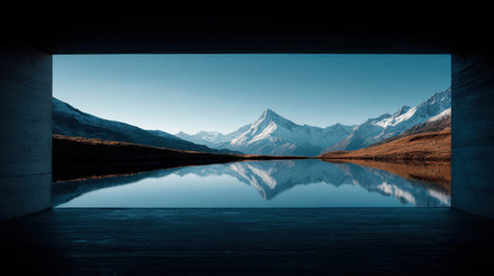 Serene Mountain Reflection in Calm Water with Clear Sky and Tranquil Landscape Framed by Modern Architecture