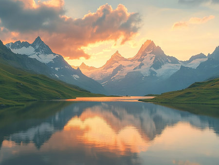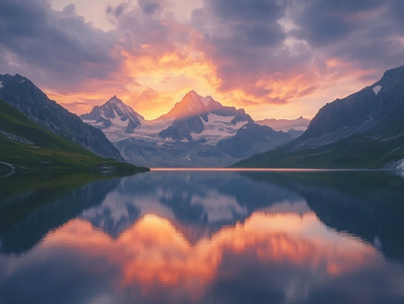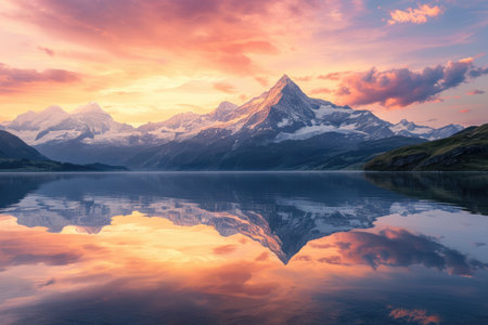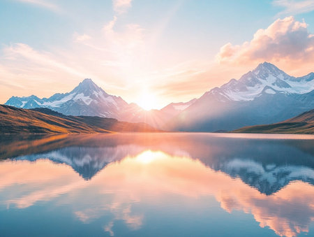 Beautiful sunrise over snow-capped mountains reflecting in a calm alpine lake, showcasing a breathtaking natural landscape.