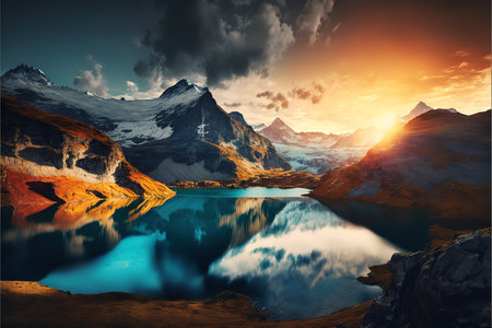 A majestic mountain landscape at sunset, snow-capped peaks, a crystal-clear lake reflecting the vibrant sky, serene nature. Resplendent.