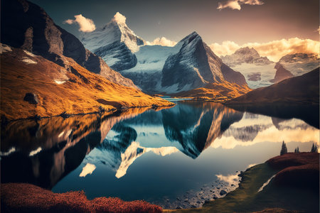 Beautiful evening panorama from Bachalp lake / Bachalpsee, Switzerland. Picturesque summer sunset in Swiss Alps, Grindelwald, Bernese Oberland, Europe. Beauty of nature concept background.
