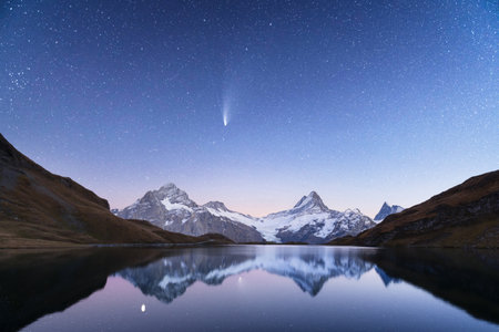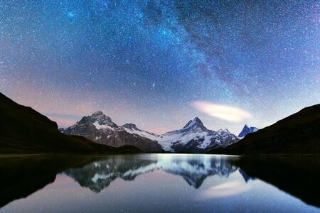 Incredible night view of Bachalpsee lake in Swiss Alps mountains. Snowy peaks of Wetterhorn, Mittelhorn and Rosenhorn on background. Grindelwald valley, Switzerland. Landscape astrophotography