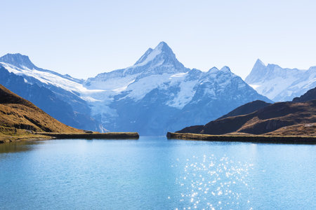 Picturesque view on Bachalpsee lake in Swiss Alps mountains. Snowy peaks of Wetterhorn, Mittelhorn and Rosenhorn on background. Grindelwald valley, Switzerland. Landscape photography