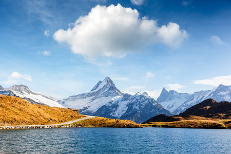 Splendid norning view of Bachalp lake / Bachalpsee, Switzerland. Fantastic autumn scene of Swiss alps, Grindelwald, Bernese Oberland, Europe. Beauty of nature concept background.