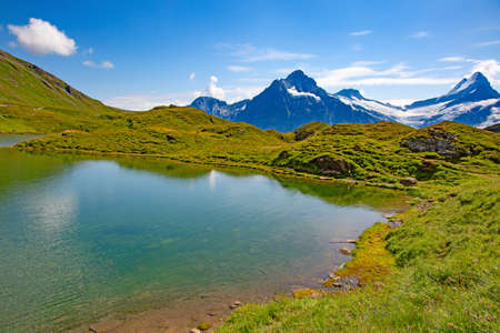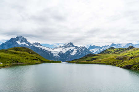 Picturesque view of mountain lake Bachalpsee with the snow capped peaks of Wetterhorn, Schreckhorn and finsteraarhorn in the background. Grindelwald, Jungfrau region, Switzerland