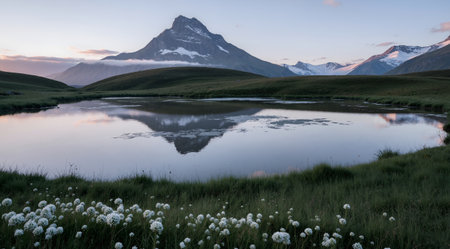 serene mountain lake with clear water, surrounded by green hills and purple wildflowers in the foreground
