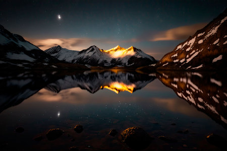 Alpine lake Bachalpsee under night starry sky with snow-covered peaks
