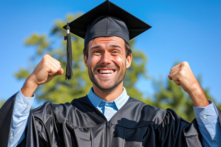 A proud young man celebrates his graduation in a cap and gown, showcasing his joy and determination at an outdoor ceremony surrounded by fellow graduates.