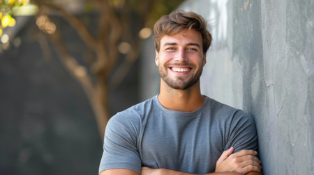 A young man poses with a warm smile in soft natural light. The blurred background creates a serene and joyful atmosphere, perfect for capturing moments of happiness.