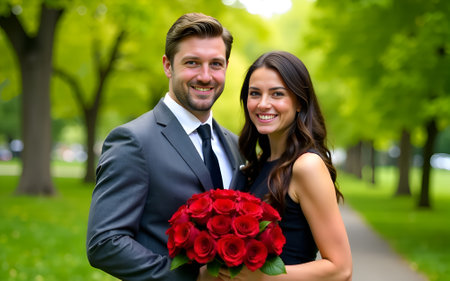 Portrait of Caucasian man in gray suit and young woman in black dress with bouquet of red roses. Happy couple on blurred background of green trees of park.