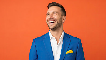 A man smiles broadly, dressed in a bright blue blazer. His white shirt and a yellow pocket square provide contrast. Set against a warm orange backdrop, the image is well-lit, with a focus on his expression. Suitable for commercial projects that aim to evoke positivity, happiness, or success.