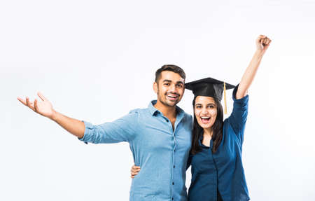 Beautiful young Graduate Indian girl student celebrating success with male friend while wearing graduation ceremony Hat against white background