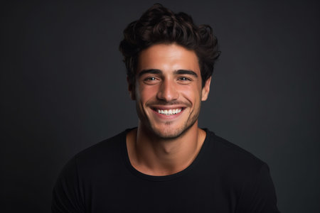 Portrait of a handsome young man smiling at the camera on a dark background.