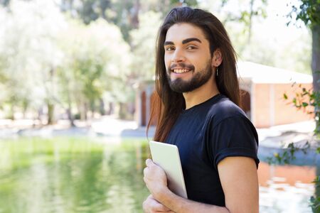 Happy pensive long haired guy posing outside with tablet. Handsome bearded young man standing in park, holding and embracing digital device, looking at camera, smiling. Communication concept