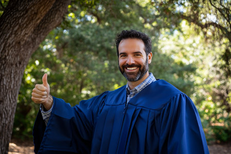 Joyful graduate in blue gown giving thumbs up with lush tree backdrop celebrating achievement
