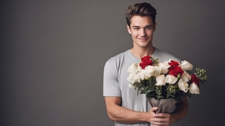 Handsome man holding the bouquet of flowers for gift for valentines or birthday celebration. Smiling male in white shirt holding flowers isolated on the grey background.