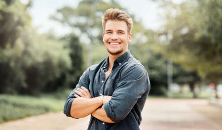 Portrait of a handsome young man smiling at the camera while standing outdoors.