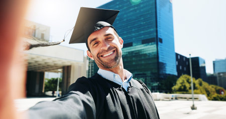 City, graduation and selfie of man student outdoor for celebration or education event. Future, scholarship and social media with happy college or university graduate in urban town for profile picture