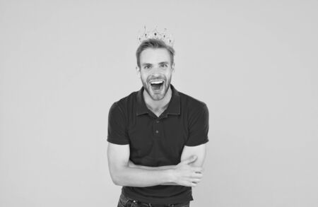 Having fun. party king. imagine he is center of world. being egoist is happy life. reward for your . smiling man in crown. selfish man dream about popularity. royal family roots. live in luxury