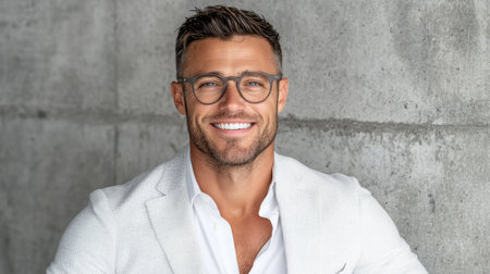 A young man beams with happiness, dressed in a smart jacket and posing against a neutral backdrop. His friendly expression radiates warmth and confidence.