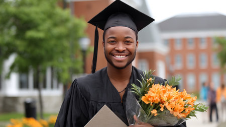 A graduate holding a bouquet of flowers and a diploma, smiling broadly, standing outside their college in full cap and gown.
