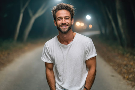 Smiling Man on Forest Road at Night