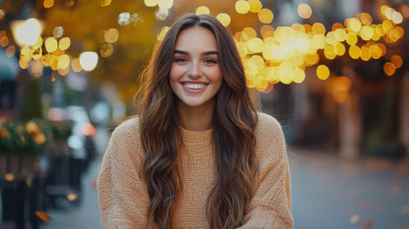 A woman with long hair smiles joyfully while wearing a cozy sweater in a city street adorned with glowing lights. Autumn leaves add a warm touch to the atmosphere.