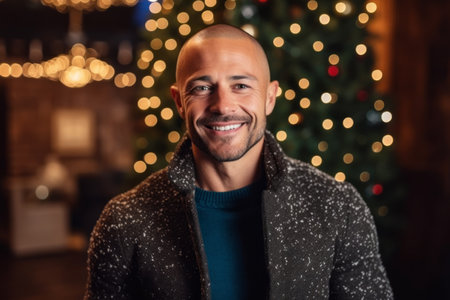 Portrait of a handsome young man smiling at the camera in front of a Christmas tree