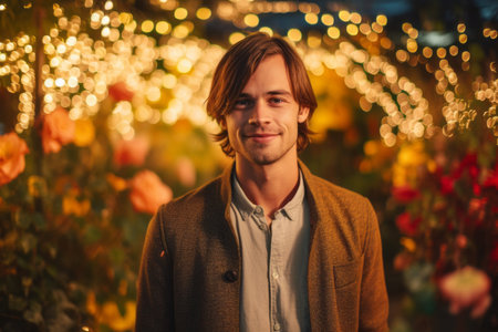Portrait of a handsome young man standing in a flower garden.