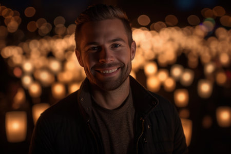 Portrait of smiling young man in front of burning candles at night
