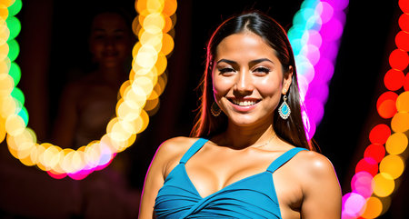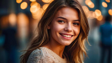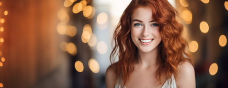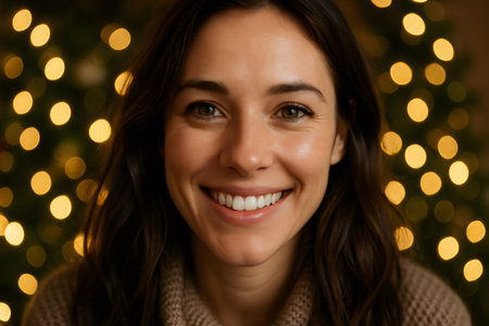 Smiling woman portrait in festive setting. Holiday celebration concept with warm bokeh lights in background, expressing happiness