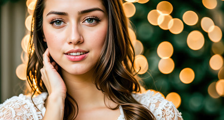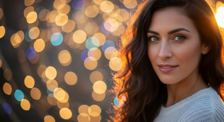 A stunning portrait of a young woman with captivating eyes, styled in a fashionable sweater. The soft glow of twinkling lights creates a warm, festive atmosphere, highlighting her beauty and elegance.