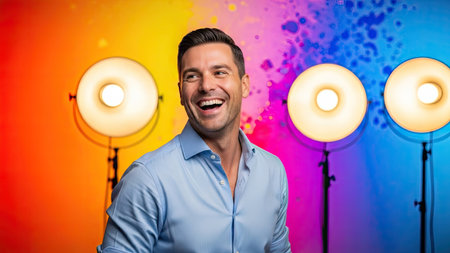 A man smiles broadly, positioned before a vibrant, multicolored background. Overhead lighting illuminates the scene. The image showcases a studio setting, suitable for various commercial applications. The composition emphasizes the subject, with potential uses including advertising and editorial content.