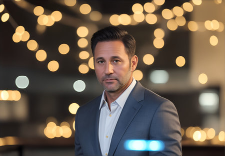 Portrait of handsome mature man in front of christmas lights.