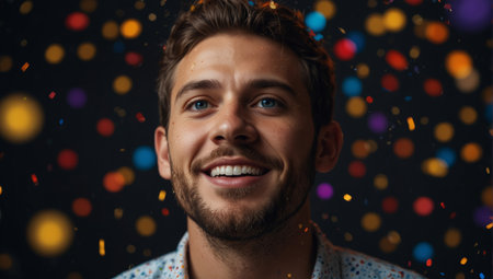 Portrait of a man celebrating with brightly colored falling confetti.