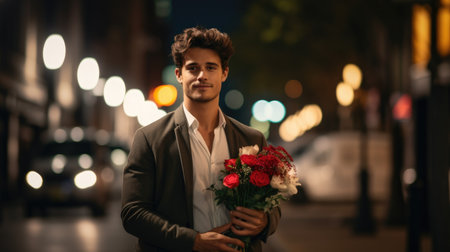 Man with a bouquet of flowers. The guy holds a congratulatory bouquet of flowers for Valentine's Day, birthday, wedding, Mother's Day, Happy March 8th. Evening time in the background
