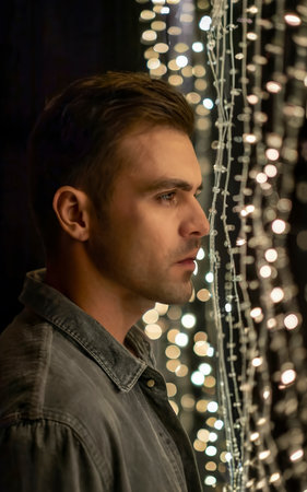 Close-up man side view and curtain of sparkles