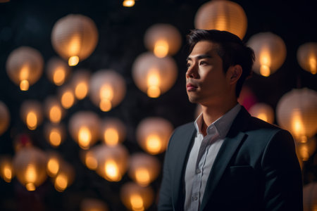 Portrait of a handsome young asian man in a suit with lanterns.