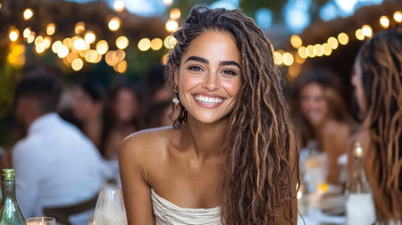 A young woman smiles warmly, illuminated by soft lights at an evening gathering in an urban setting.