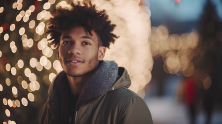 Portrait of handsome african american man with afro hairstyle wearing warm jacket and scarf on blurred background of Christmas lights