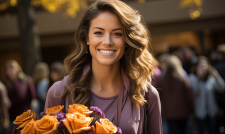 A joyful woman stands holding a colorful bouquet of flowers, a bright smile lighting up her face.