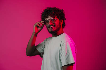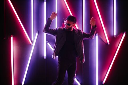 Stylish man in sunglasses on a bright background illuminated by neon light.