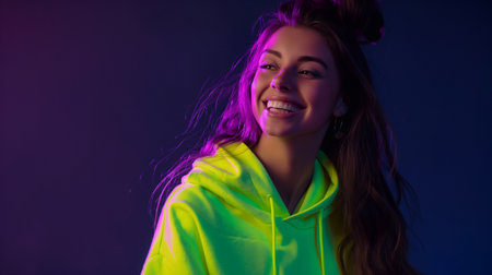 portrait of smiling young woman in yellow hoodie on purple background