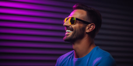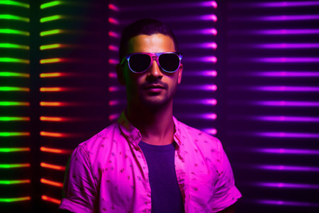 Portrait of a handsome young man wearing sunglasses in front of colorful neon lights