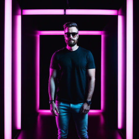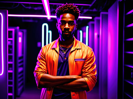 AI Generated. Young man poses confidently in a striking blue light setting with glowing neon accents