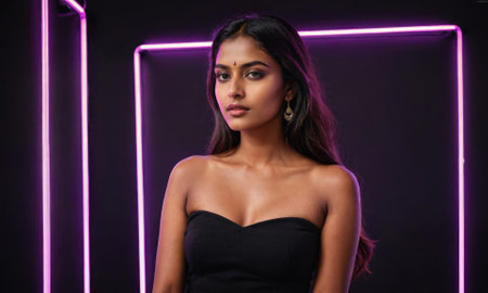 A woman with long dark hair poses in front of a purple neon light